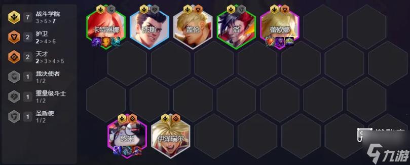 棋子及羁绊如图所示 装备分析后排装备羊刀直接做(羊刀过渡平滑且多个运营阵容能用。例如重秘、阿卡丽过渡装。)前排龙牙反甲狂徒(首先是所有阵容的通用防装,其次8战斗在8人口只有1个前排没有保镖羁绊的前提下,给日女做这三件装备能保证杰斯的有效输出环境)。阵型站位日女单顶。