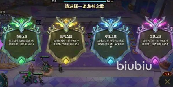 核心条件:获取「高级月光」海克斯龙神满意度机制 在2-2回合选取龙神之路,根据开局情况决定策略:胜利之路(金色):适合开局强势(如3怒翼龙+2星瑟提),每胜利一次+4满意度。 隐忍之路(紫色):开局弱势时选取连败,每失败一次+5满意度。
