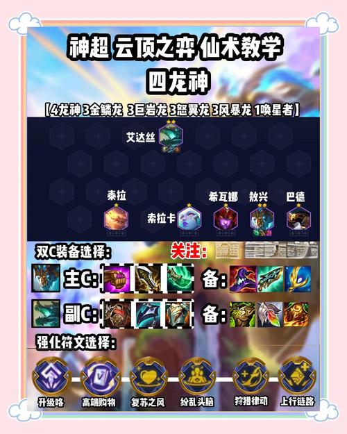 S5版本四龙神玩法及完美阵容搭配攻略 阵容组成与羁绊 阵容成员:杰斯,索拉卡,艾达丝,希瓦娜,泰拉,敖兴。阵容羁绊:4龙神3金鳞3怒翼3风暴3巨岩。核心龙神为希瓦娜和泰拉,搭配法系输出敖兴。强化符文选取 首选:龙神之魂,龙神时代,黄金门票。这些符文能显著提升龙神的战斗力或成型速度。