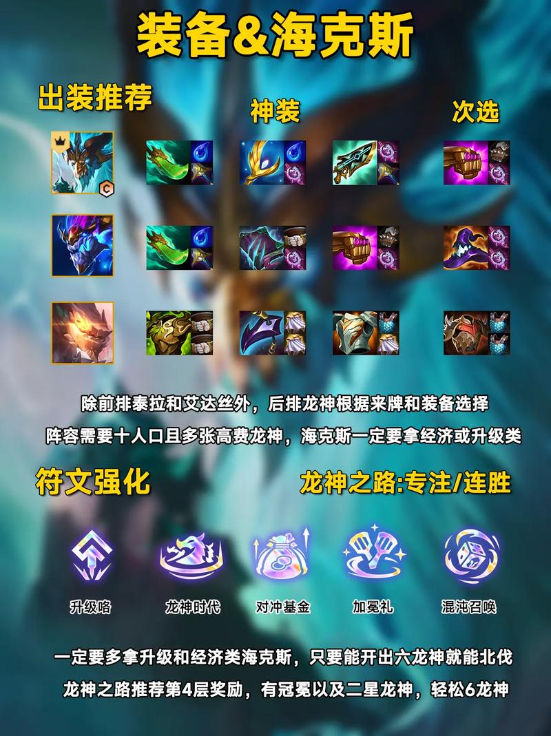 阵容核心构成 四龙神:赛芬、艾达丝、希瓦娜、敖兴。这四位英雄各具特色,形成完美互补。赛芬作为前排坦克,艾达丝提供控制和爆发,希瓦娜灵活输出,敖兴则是终极杀器。装备分配建议 赛芬:建议配备日炎斗篷或狂徒铠甲,增强其生存能力,更好地承担前排伤害。