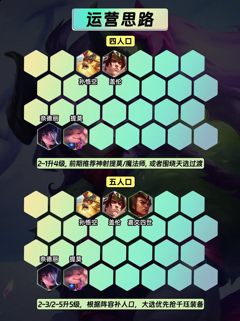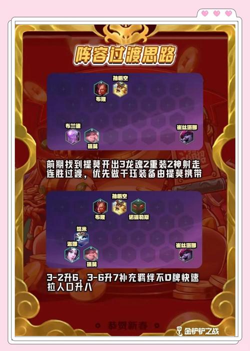 强势上分阵容推荐 秘术+神射轮子妈 这套阵容非常容易凑齐,且强度较高。开局拿神射手天选,然后开始拿其它羁绊牌。关键是要早拉7级刷出神射手轮子妈,并尽快将其升至三星。同时,也要注意拿三星刀妹作为前排抗伤害。上了三星轮子妈+三星刀妹后,在四阶段基本能保持连胜。后续可以攒钱上8上9,补充锤石和永恩等英雄。