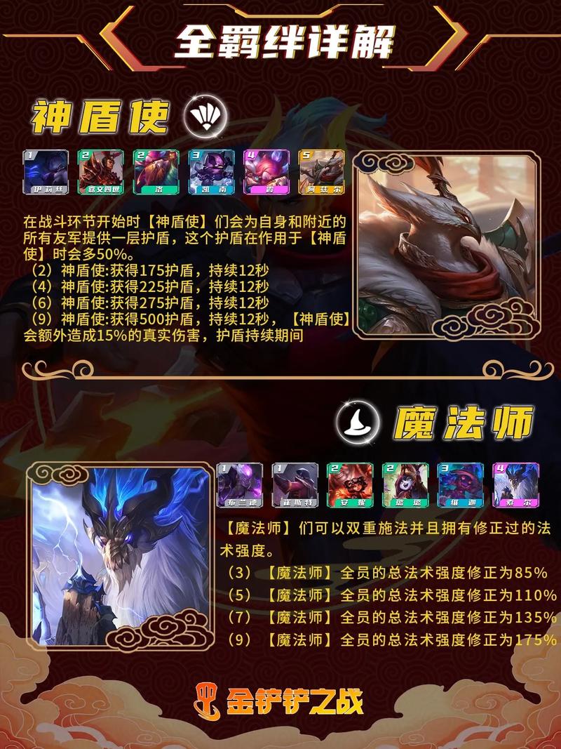 宗师 效果:在战斗开始时,宗师会降低敌人50%攻击速度.『2』 持续3秒 『3』 持续5秒 『4』 持续8秒 重装战士 效果:重装战士们获得额外护甲。『2』 100护甲 『4』 200护甲 『6』 500护甲 月神 效果:把星级最低的月神英雄增加1星,如果等级一样那么就选装备比较多的。