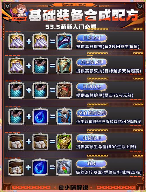 薇古丝:蓝buff(必备)、法爆(必备)、巨杀(可选,提高处理前排速度)。备选装备:大天使、大帽子、破防者、正义等。拉莫斯:狂徒、反甲、龙牙等肉装,备选装备:日炎、圣盾使、救赎、石像鬼等。