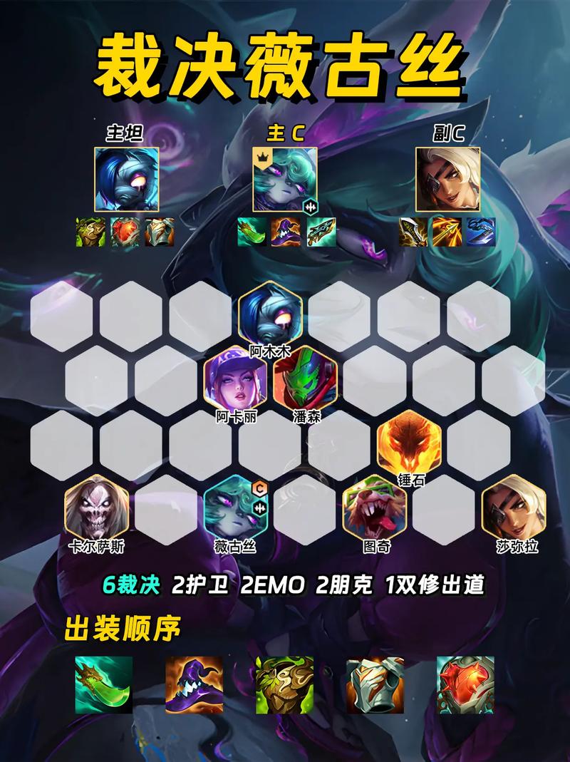 阵容构成 核心组合:“双喜维格斯”4审判2EMO2守卫阵容,主要瞄准3费卡作为主力C。升级与节奏 前期:尽快升级,21升25升32升6,4142升7,确保阵容的稳定性和战斗力。 中期:7级时开始提升3费卡的品质,尽量将主C薇古丝升级到三星。 后期:根据情况增加人口,进一步完善阵容。