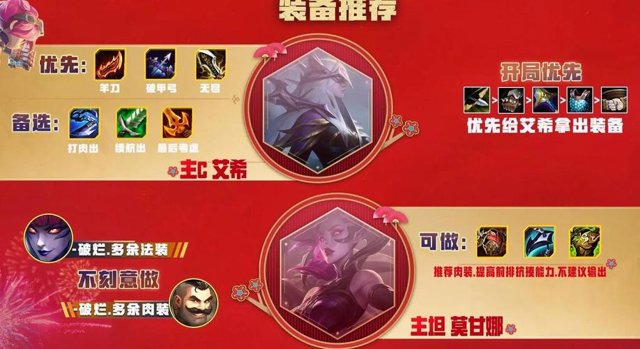 核心英雄:厄运小姐(女枪)、烬、塞恩。厄运小姐:作为阵容的主要输出点,装备选取青龙刀+法爆+无尽/巨杀/大天使,青龙刀必备以加快技能释放频率。烬:装备选取轻语+无尽/巨杀+复活甲/水银/飓风,轻语和无尽是标配,最后一件可根据情况选取保命防装。