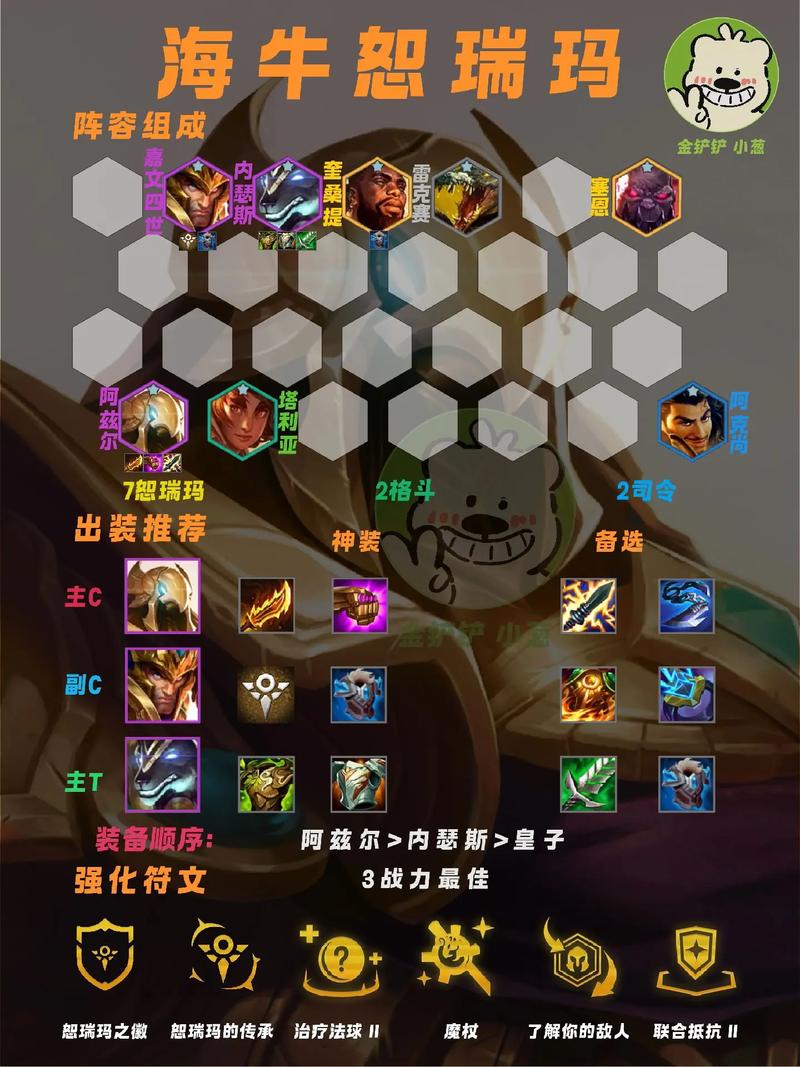 〖Three〗、金铲铲S9符文大陆推荐阵容如下:高爆发输出型阵容皮城祖安枪:以四枪手为核心,泽丽作为主C,中期通过霸龙+金克斯拿装备过渡,节奏紧凑,4-1阶段升至七级后D牌强化阵容。六法拉克丝:依赖法转开启六法师羁绊,7级即可成型,法师中低费卡多,过渡平滑。