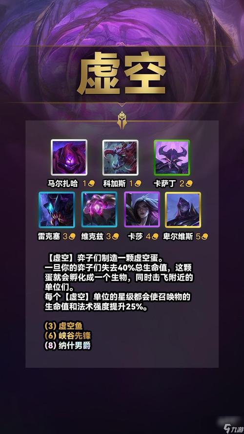 〖Two〗、虚空:可能包含真实伤害、无视防御等效果。职业羁绊:刺客:专注于单体爆发,快速秒杀敌方核心。帝国:提供额外的伤害加成或技能效果。斗士:近战输出,拥有较高的生命值和防御。守护者:提供保护和控制效果,为队伍创造输出环境。枪手:远程输出,拥有较高的攻速和暴击率。