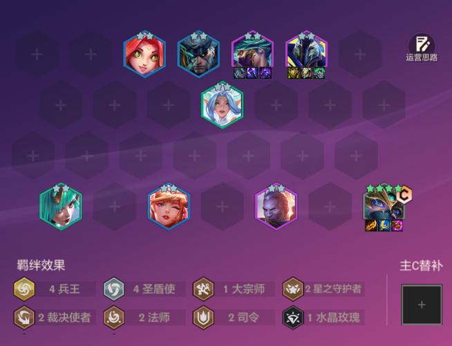 〖Three〗、怪兽、3秘术卫士、3战斗机甲、2星之守护者、2护卫、2迅捷射手、1精英战士。这些羁绊的组合能够大幅提升阵容的整体战斗力。强化符文选取:优选:珠光莲花(提升法术暴击伤害)、狩猎律动II(提供持续回血能力)、背水一战(低生命值时提供额外攻击力和法术强度)。