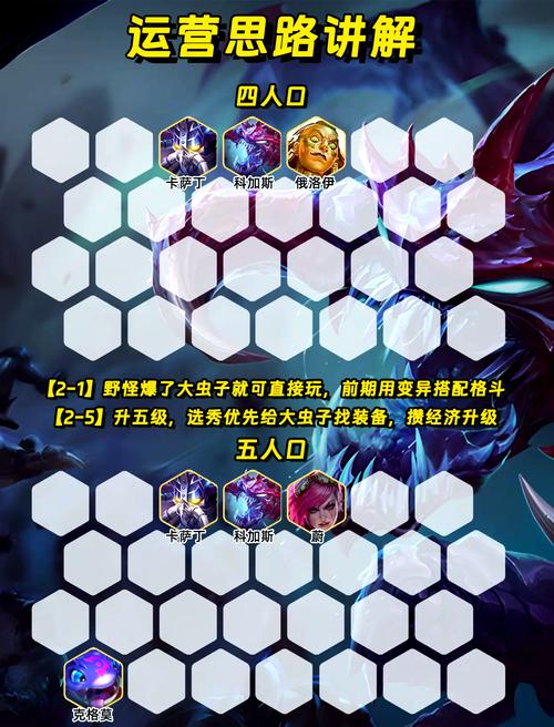 金铲铲之战S5冒险换形呲呲玩法攻略 阵容组成与羁绊核心阵容为呲呲、希瓦娜、杰斯、图奇、巴德、赫卡里姆、瑟庄妮,最终羁绊为7冒险家、1吟游诗人、4怒翼龙、2换形师、2重骑兵、2龙神。站位上,赫卡里姆和杰斯需针对敌方核心输出位,利用重骑兵和换形师的坦度吸引火力,为呲呲创造切入环境。