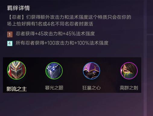 羁绊效果:忍者羁绊的效果是简单粗暴地增加攻击力与法术强度。这一效果能极大增强忍者棋子的输出能力,使他们在战斗中更具威胁性。具体来说,当只有1名忍者在场时,该忍者会获得额外的攻击力和法术强度加成;而当4名忍者全部在场时,他们都将获得更为显著的攻击力和法术强度加成。