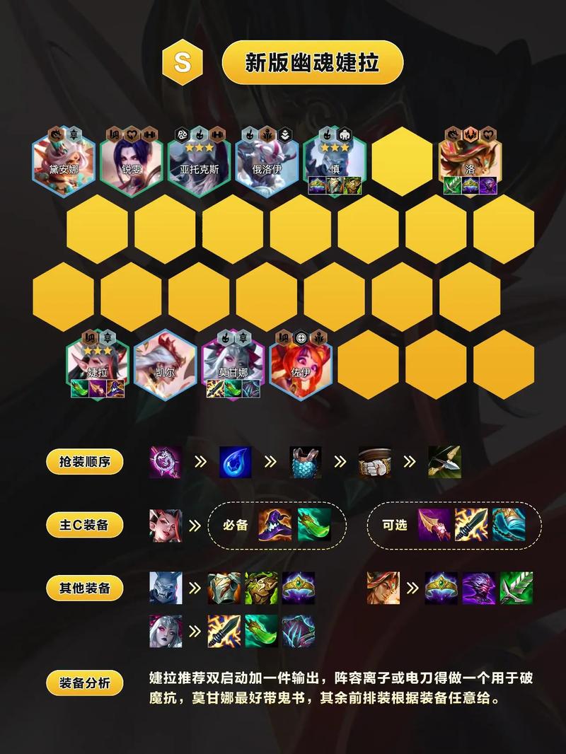 阵容搭配: 组成:婕拉、萨勒芬妮、塞拉斯、诺姆希、璐璐、潘森、赛芬。 羁绊:6幽影龙、4魔导师、龙族小天才、2格斗家、2狂刃战士、2龙神。出装思路: 婕拉:主打鬼索,以快速叠加攻速,提高普攻效率与技能释放频率。