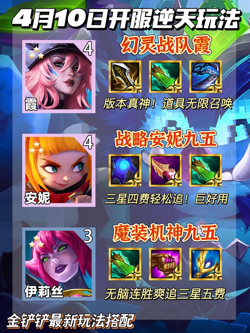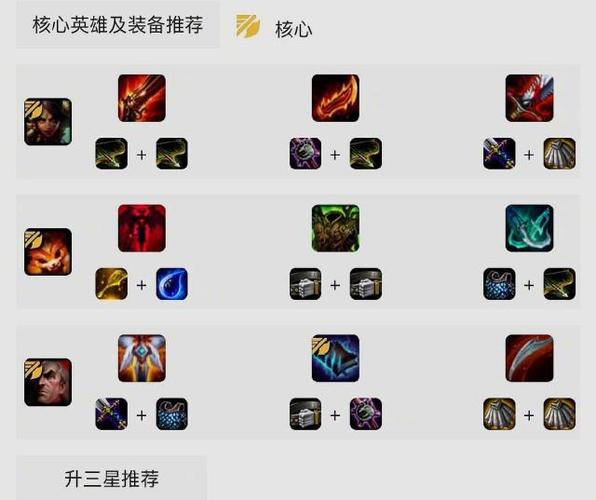 特点:回血能力极强,上分神器。核心英雄:奶妈(主C),加里奥(主坦)。羁绊效果:以巨神峰和神谕者为主。装备推荐:奶妈装备法爆、大天使、科技枪;加里奥装备板甲、龙牙、反甲。裁决天使阵容 特点:超级强悍,大成吃鸡。核心英雄:天使(主C),波比(主坦)。