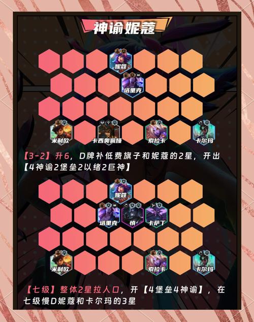 沙皇与岩雀站两侧角落,其余前排站第一排。狗头与沙皇站同侧保护沙皇,奎桑提与沙皇站对侧防止沙皇被踢走。剑魔与纳亚菲利站在狗头两侧,提供暗裔复活效果。搜牌节奏 4-1升七人口后大D出二星沙皇和二星狗头,组成6恕瑞玛2司令2神谕。血量安全时可在七人口划水,八人口再启动D牌。