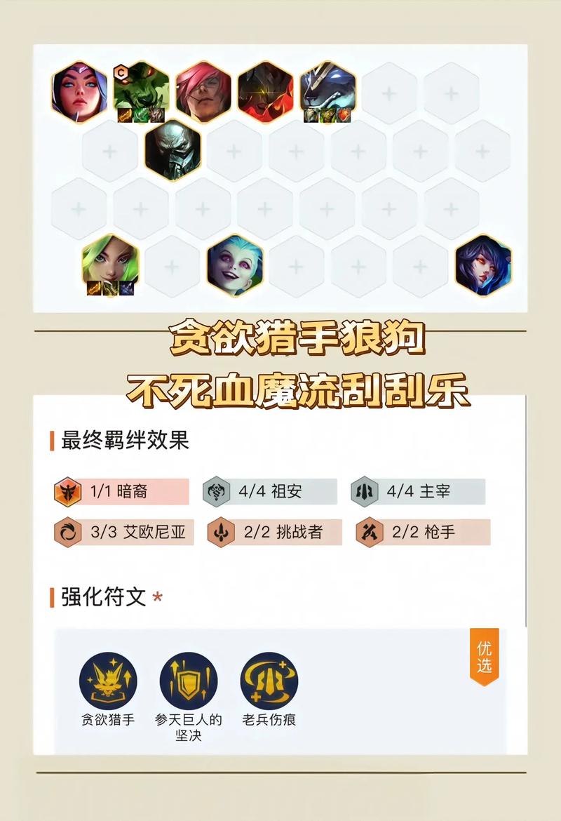 〖Two〗、一费卡:奎桑提、莉莉娅二费卡:盖伦、萨勒芬妮三费卡:莫德凯撒、艾克四费卡:阿狸、布里茨五费卡:娑娜主要羁绊:6秘术护卫3法师3KDA装备推荐:主C阿狸:蓝buff或朔极之矛必备,第二件优先科技枪,第三件法系输出装(如纳什之牙)。主坦布里茨:离子火花和通用肉装(如狂徒、坚定之心、冠冕)。
