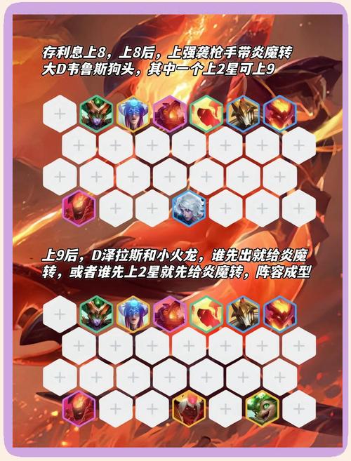 金铲铲之战s12炎魔龙族九五阵容的玩法及推荐如下:角色搭配 核心角色:斯莫德(小火龙)、内瑟斯(狗头)、韦鲁斯、米利欧、黛安娜、慎、希瓦娜、阿卡丽。羁绊构成:4炎魔、2龙族、2强袭枪手、2堡垒卫士、2换形师。装备选取 抢装顺序:大剑、女神泪、反曲弓、巨人腰带、负极斗篷。
