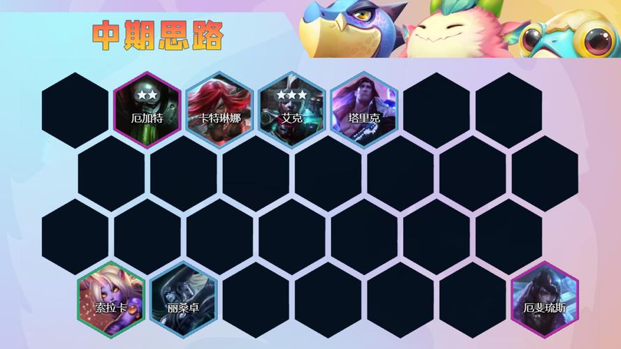 〖Two〗、阵容组成 核心成员:爆爆、特朗德尔、普朗克、伊莉丝、艾克、库奇、金克丝。补充成员:兰博、梅尔。八级时可选蔚替换某成员,以触发更多羁绊效果。羁绊构成:6极客(核心)、3伏击、2格斗、2双形。极客羁绊提供护盾和装备增强,艾克作为核心输出。