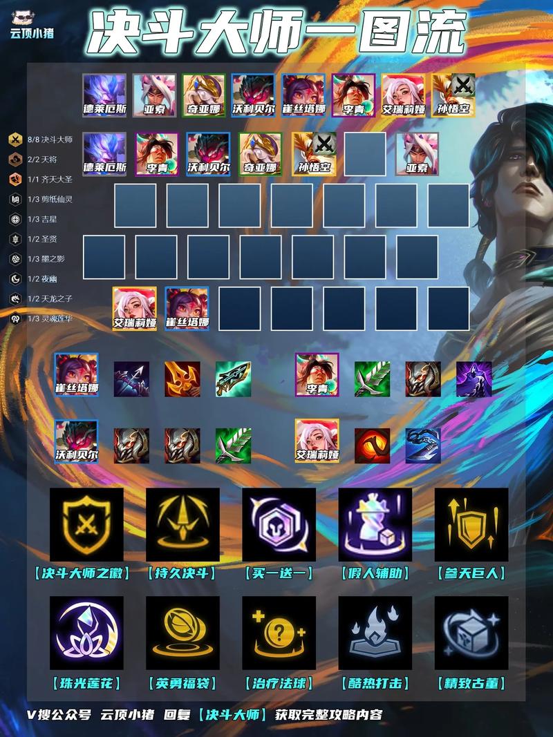 〖Five〗、金铲铲之战决斗大师玩法全解析:阵容搭配与实战技巧 阵容搭配 核心英雄选取:亚索:作为决斗大师的明星角色,亚索凭借其风墙和高攻击力,在团战中能发挥关键作用,有效抵挡敌方飞行道具并切入后排造成高额伤害。