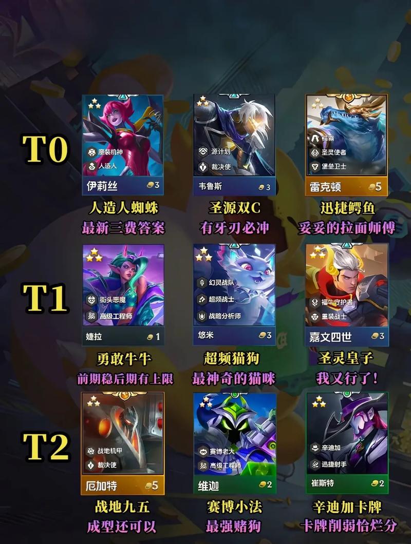 〖Two〗、金铲铲新版本最强阵容有多个选取,以下是一些推荐的阵容:水晶95阵容(版本之子)羁绊组成:7水晶玫瑰 + 2护卫 + 2主宰 + 1星守。核心棋子:寒冰作为主C,拥有高爆发和控制能力;乌鸦作为主坦,能够承受大量伤害;布隆作为副坦,提供额外的防御和控制。