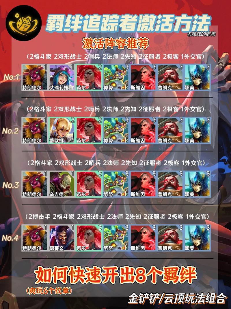 〖Three〗、阵容搭配:为了达成8个非唯一羁绊的条件,玩家可以采用特定的阵容搭配。例如,有玩家推荐了使用神龙尊者、换形棋子等核心棋子来构建阵容。这样的阵容搭配可以更容易地满足羁绊要求,从而开出羁绊追踪者。利用低费棋子:在构建阵容时,玩家可以考虑使用一些低费的棋子来作为基础。