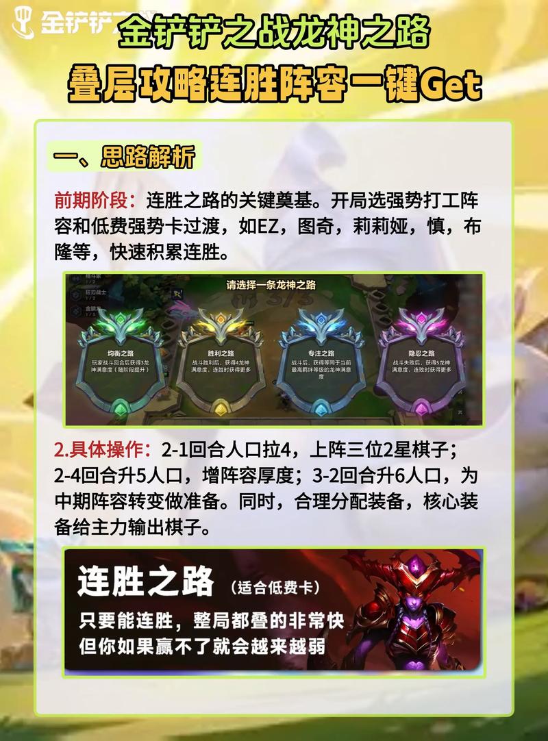 核心条件:获取「高级月光」海克斯龙神满意度机制 在2-2回合选取龙神之路,根据开局情况决定策略:胜利之路(金色):适合开局强势(如3怒翼龙+2星瑟提),每胜利一次+4满意度。 隐忍之路(紫色):开局弱势时选取连败,每失败一次+5满意度。