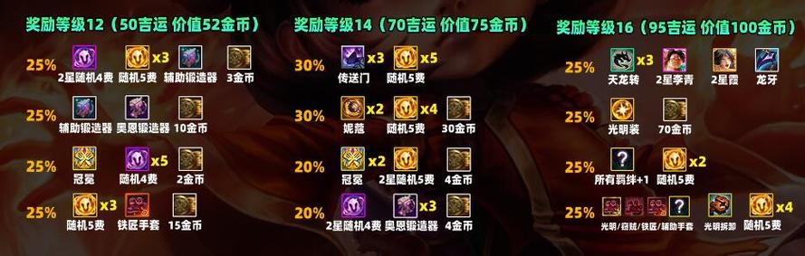 〖One〗、金币+妮蔻2+5费卡4等高额奖励,每种组合概率在20%-30%之间。第十六层:包括天龙转职、光明偷偷、所有羁绊+1等稀有奖励,每种组合概率均为25%。第十八层:光明装假人+辅助装假人+2星瑟提等高价值奖励,每种组合概率在20%-40%之间。第二十层:100金币+加60小英雄血量等超级奖励,每种组合概率均为25%。