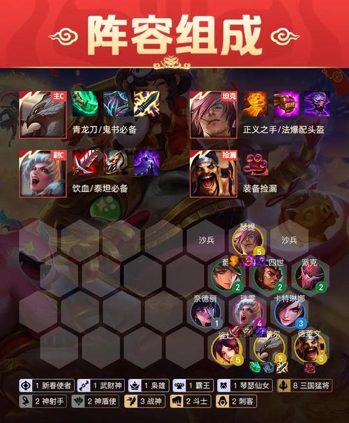〖Two〗、通用装备搭配思路 在金铲铲之战s11恭喜发财阵容中,装备的选取往往需要根据英雄的技能特性和阵容的整体需求来决定。一般来说,输出型英雄需要攻击力、攻速或法强装备,而前排坦克则需要生命值、护甲和魔抗装备。