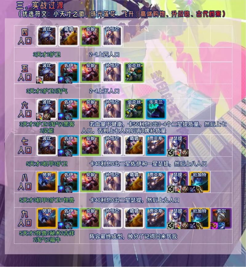 〖Four〗、首先是名流巨像卡莎阵容。该阵容包括塞恩、加里奥、卡莎、风女、撒勒芬妮、猫咪和宝石。此阵容拥有3社交名流、1猫猫、2巨像、2白魔和2学者羁绊。在前中期过渡阶段,我们应尽量选取最强战力进行连胜。前期留牌主要考虑对子和青钢影、男刀、乌鸦、巨魔等高战力单卡。