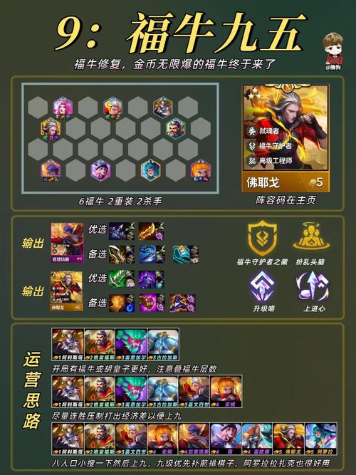 〖Two〗、金铲铲之战S5精密九五阵容的玩法攻略如下:阵容构成与核心思路 阵容构成:该阵容以4高精密发条、2狙王、3创造者、2极克等羁绊为主,核心英雄包括泽丽、暴走萝莉等高品质4费卡。 核心思路:通过高品质英雄和装备搭配,以及精密发条的攻速加成,快速提升英雄技能释放效率,从而在战斗中占据优势。