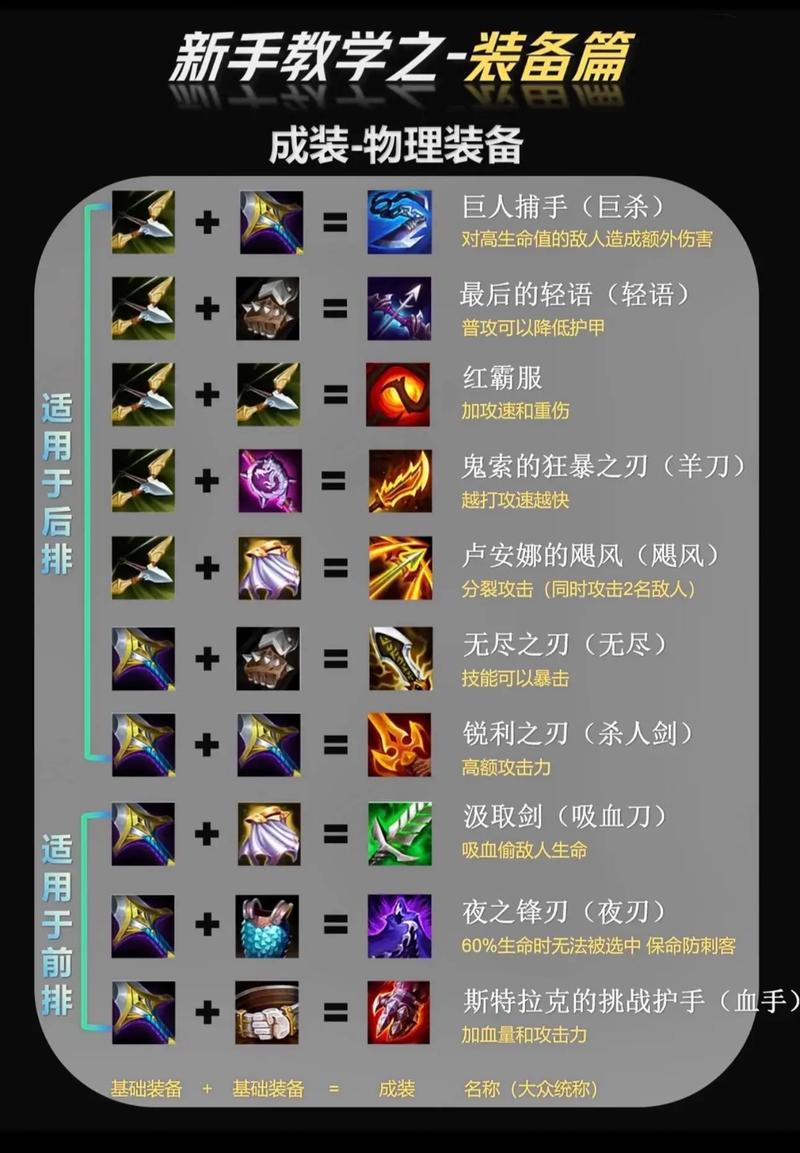 〖Six〗、《金铲铲之战》装备合成图超高清图鉴(最新S5版本):无尽之刃:由暴风大剑+拳套合成,提供高额攻击力和暴击伤害。海克斯科技枪刃:由暴风大剑+无用大棒合成,攻击造成额外魔法伤害并治疗自身。朔极之矛:由女神之泪+暴风大剑合成,技能施放后更快回蓝。