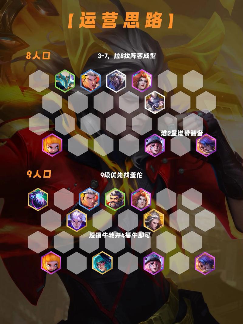 前期过渡:比较好是使用福牛体系内的男枪带装备过渡,若没有男枪,可以使用一费卡如塞拉斯、小丑、蔚或豹女带战士装过渡,或者二费卡如德莱尔斯、纳亚菲利带装备过渡。中期节奏:保血到4-1升7人口,第一波启动,找到7人口阵容并有两星皇子。连败也能玩,但比较好顺便吃执事,强化符文偏好延迟战力。