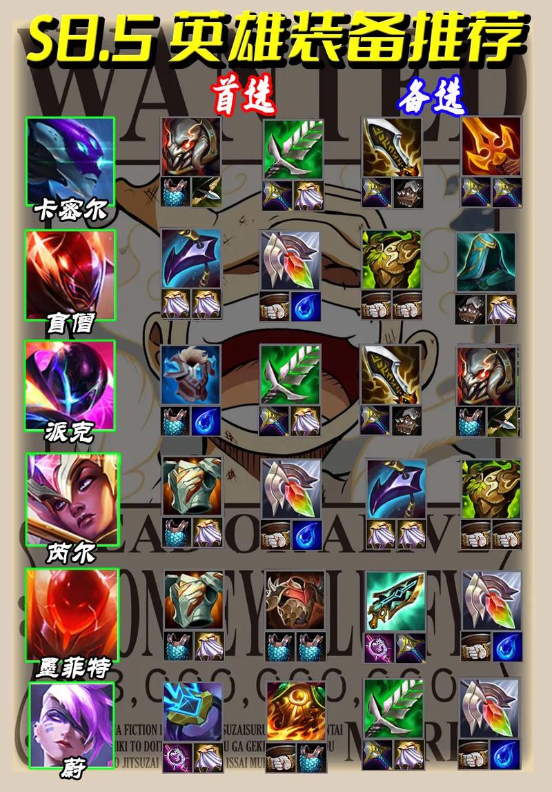 〖One〗、乐芙兰:珠光护手(法强+暴击)、蓝霸符(法力续航)、破防者或巨人捕手(针对坦克或高血量敌人)。布里茨(或其他坦克):石像鬼板甲、日炎斗篷、救赎等坦克装备。艾克/安妮:离子火花(降低敌方魔抗)、狂徒铠甲、龙牙等。索拉卡:多余坦度装备。