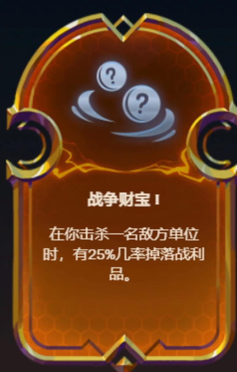 孤身上路很危险:单位阵亡时,将装备传递给最近的己方弈子。弈士的利器:提供金铲铲。药剂师III:单位获得更多实际伤害值的治疗效果,溢出治疗全部转化为下次攻击的魔法伤害。英雄传说之力特殊符文强化 战争财宝III:击杀敌方单位时有几率掉落战利品。