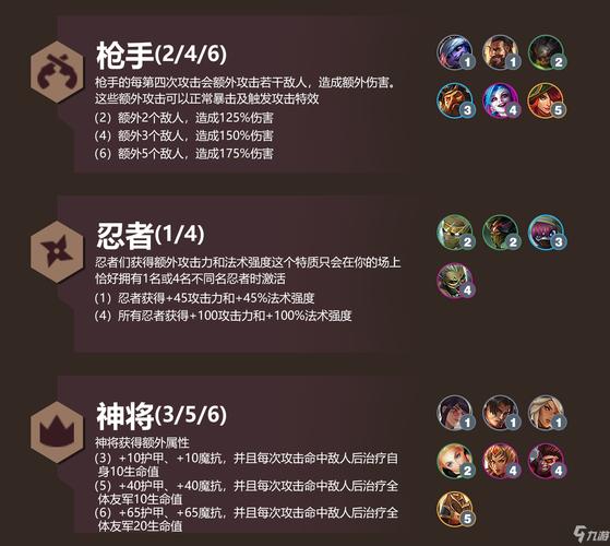 羁绊效果:战斗开始时,所有守护者和邻近格子的友军获得30点护甲加成。1 枪手:羁绊效果:枪手在攻击后,有50%几率对范围内随机一个敌人/全体敌人打出额外攻击。1 剑士:羁绊效果:剑师的每次攻击有35%几率打出额外攻击,6个剑师时,每次攻击有35%几率打出2次额外攻击。