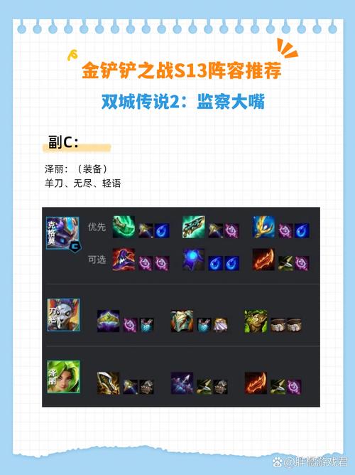 〖Three〗、在《金铲铲之战》S13赛季中,针对大嘴(克格莫)的异变选取推荐如下:剔除弱者 推荐理由:此异变非常适合大嘴的输出特性。大嘴作为一名高爆发英雄,能够在短时间内对敌人造成大量伤害。剔除弱者异变提供的高额暴击几率,可以让大嘴更轻松地收割残血敌人,快速清理战场,从而在团战中占据优势。