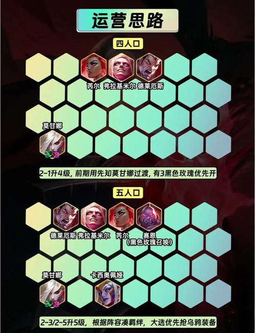 阵容核心英雄与羁绊组合核心英雄包括莫甘娜、吸血鬼、努努、蜘蛛、大头、盖伦、妖姬和蚂蚱(马尔扎哈),备选英雄为杰斯。羁绊搭配需满足以下条件:4先知:提供魔法抗性并增强输出能力。4黑玫:激活强力黑玫加成,提升整体法术强度。2双形:增强阵容灵活性,适应不同对局需求。