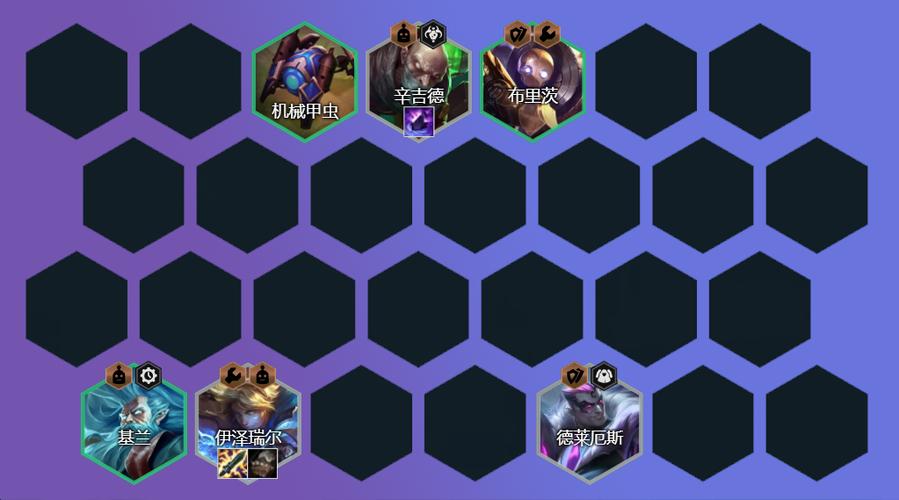 〖Three〗、阵容组成与核心 阵容成员:伊泽瑞尔、辛吉德、基兰、艾克、烬(或泽丽)、萨勒芬妮、泽丽(或烬)、杰斯。核心羁绊:发明家、精密发条、狙神。核心思路:此阵容依赖发明转职或发明之心,以发明造物机械龙和狙神羁绊为核心,机械龙提供高坦度和强输出,狙神则提供暴力物理伤害。