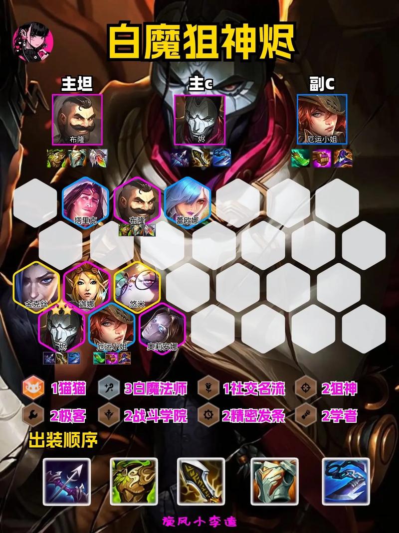 〖One〗、阵容与装备配置核心棋子为烬(主C)、蕾欧娜(主T),搭配布隆、莫甘娜、婕拉、奥莉安娜、辛德拉、泽丽组成3辛迪加+3执事+2保镖+2狙神+2精密+2学者+2白魔羁绊。
