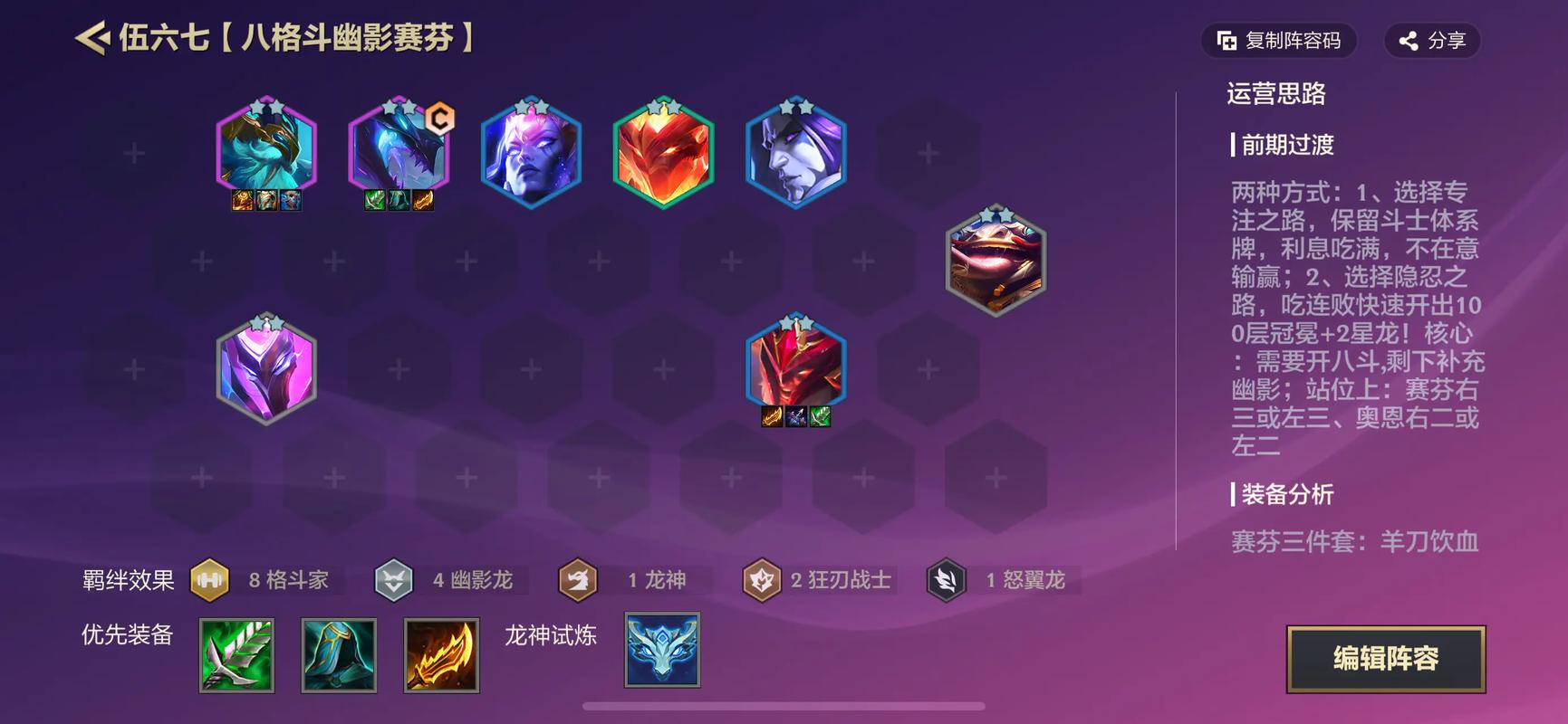 阵容组成与核心定位该阵容以赛芬为核心输出,搭配慎、触手妈(俄洛伊)、瞎子(李青)、奥拉夫、奥恩组成6格斗家羁绊,提供高额生命值和攻击力加成。幽影龙羁绊由赛芬和奥拉夫触发,可削弱敌方双抗并提升自身属性。赛芬作为主C,兼具突进与范围伤害能力;奥恩作为前排控制,奥拉夫可补充物理输出。