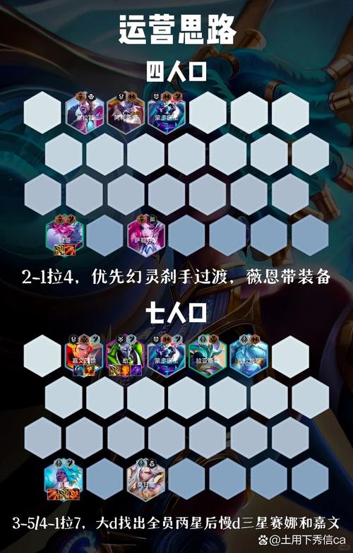 五人口推荐组合为蒙多、萨科、阿利斯塔、嘉文四世、薇恩。若无法凑齐4杀手,可以上一个圣灵英雄,如酒桶,性价比高。中期:3-2阶段拉6人口,上4杀手+阿利斯塔+凯隐/任意重装英雄。若开局连胜或听牌多,可以小抽一点,否则等3-5阶段拉7人口。3-5阶段拉7人口,除非特别穷,否则要抢牌。