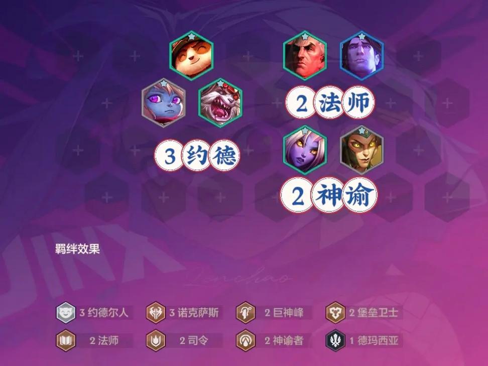 羁绊组成:同上,只是将刀妹替换为雷欧娜,依然保持8个羁绊的激活状态。巨魔、船长、娜美、乌鸦、芮尔、努努、辛吉德 羁绊组成:同样保持上述8个羁绊的激活,只是英雄组合略有不同。