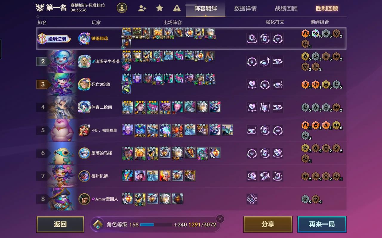 金闪闪的快乐:单人排位模式上阵至少一名3星橙卡并且获得第一名。(紫色成就)多多益善:匹配/排位模式至少10人口并且获得第一名。(紫色成就)预留了容错但没用上:排位模式130点的血量获得第一名。(紫色成就)满血第一:排位模式100点的血量获得第一名。