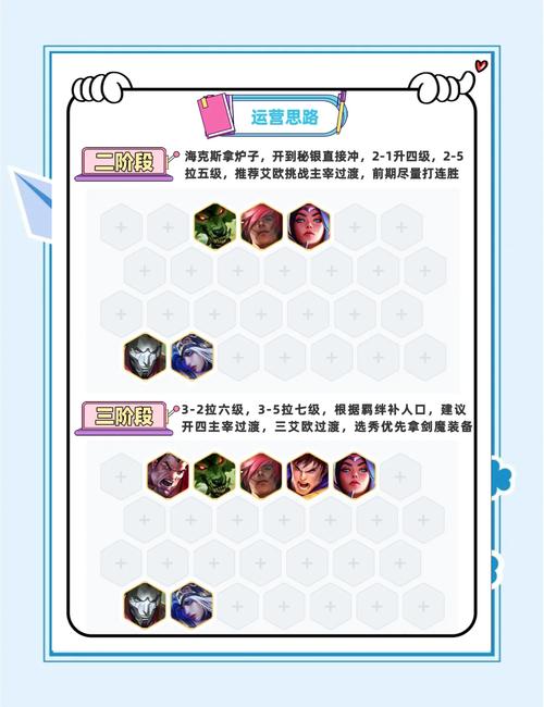 同时,注意寻找并提升关键英雄的质量,如剑魔、赛芬等。后期:在人口充足的情况下,寻找并上阵索拉卡、剑豪等英雄,进一步提升阵容的输出和控制能力。同时,注意调整站位,保护核心输出英雄免受敌方集火。