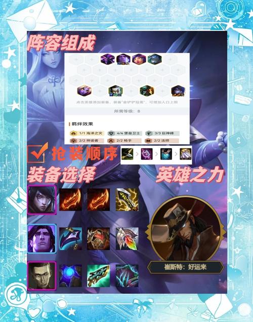 〖Two〗、阵容推荐 核心阵容:金克丝+杰斯(双C),男枪+蔚+猪妹(前排),艾克(潜行者)。羁绊组合:四枪手、三皮尔特沃夫、二祖安、二潜行。阵容优势 高额输出:四枪手羁绊能对敌方前排造成高额伤害,同时艾克和男枪的潜行者身份能对对方后排构成威胁。