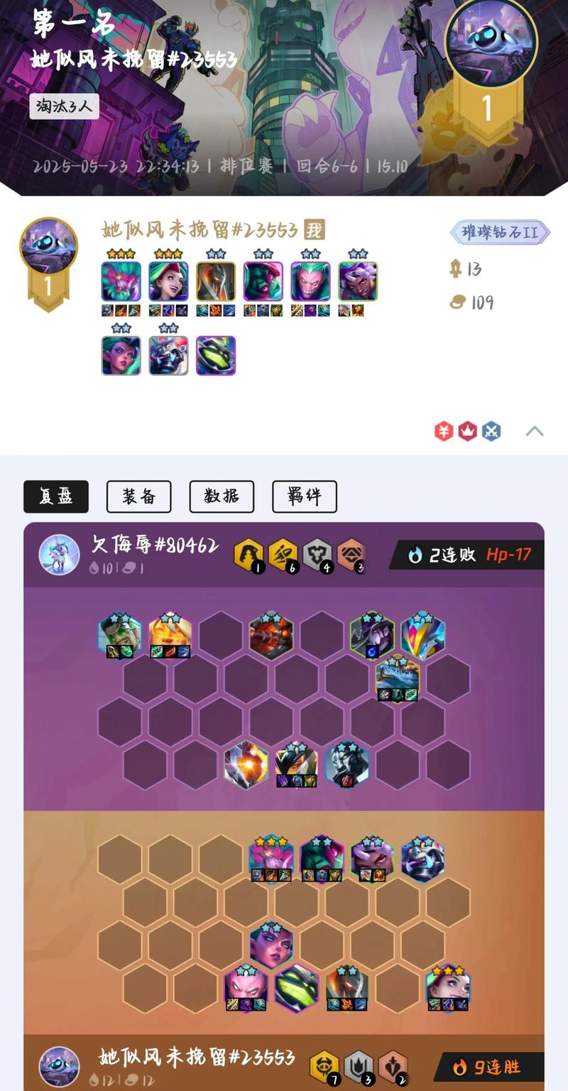 阵容与装备配置核心棋子为烬(主C)、蕾欧娜(主T),搭配布隆、莫甘娜、婕拉、奥莉安娜、辛德拉、泽丽组成3辛迪加+3执事+2保镖+2狙神+2精密+2学者+2白魔羁绊。