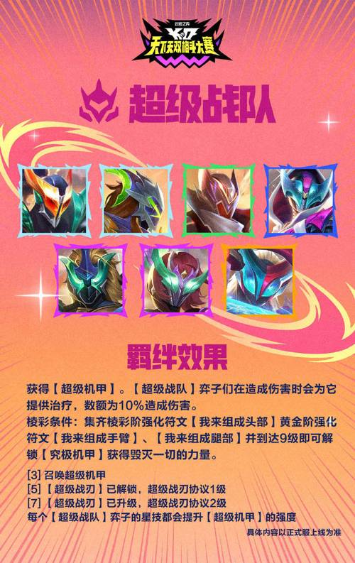 〖Four〗、以下是关于金铲铲的棱彩条件的详细解释:超级战队的棱彩条件:在S15赛季中,若玩家想要达成超级战队的棱彩羁绊,需要同时拿到“我来组成头部/手臂/腿部”这三个特定的海克斯强化效果,并且还需要在游戏中将超级战队的羁绊等级提升至九级。这一条件相对苛刻,需要玩家在游戏过程中进行精心的策略规划和资源分配。