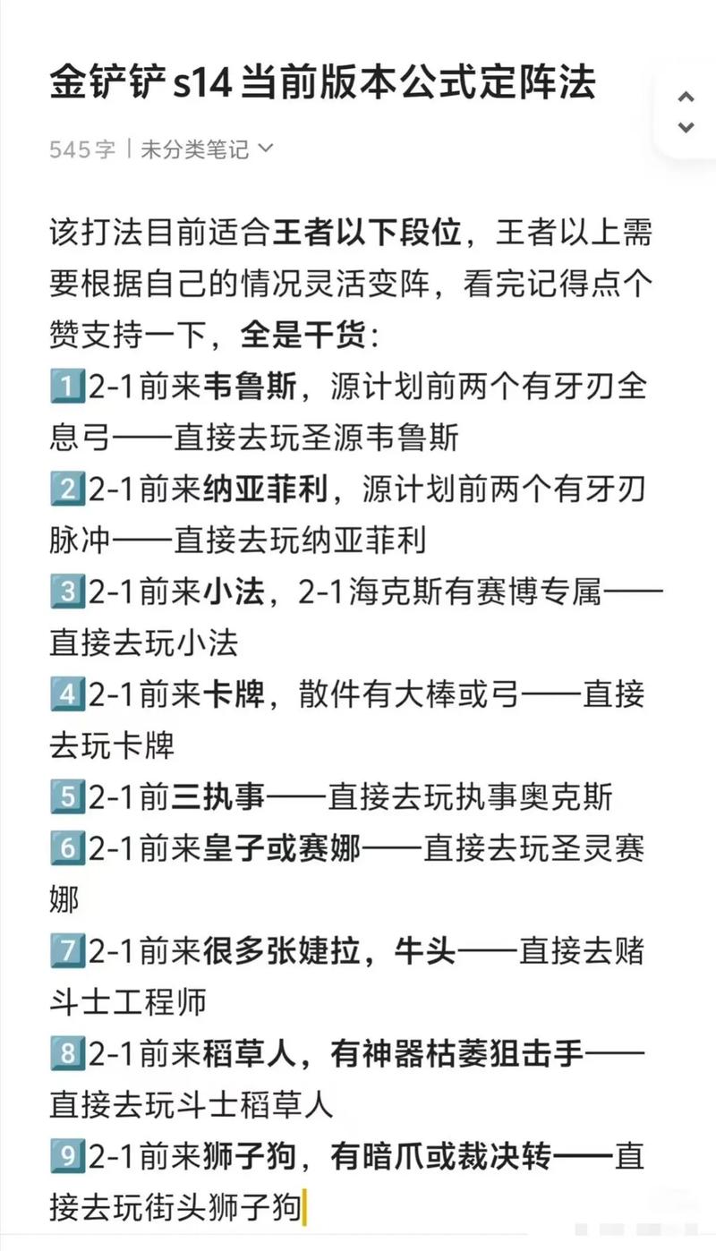 核心羁绊:6决斗大师(提供高额攻速加成)+2斗魂战士(增强前排坦度)+2主宰(提升斩杀能力)+1大宗师+1兵王。若有“决斗转”,可给婕拉并替换掉凯尔或普朗克,再补乌鸦或蔚开3水晶玫瑰。