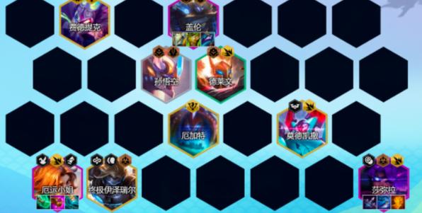 阵容构成与羁绊核心成员为孙悟空、阿利斯塔、莎弥拉、费德提克、蕾欧娜、厄加特、盖伦、终极伊泽瑞尔、努努。羁绊组合为3战斗机甲(提供前排坦度与攻击力叠加),辅以2护卫、2枪手、2秘术、2吉祥物、2怪兽、1堕落使者。若无法升至9人口,可用2星盖伦替代蕾欧娜。