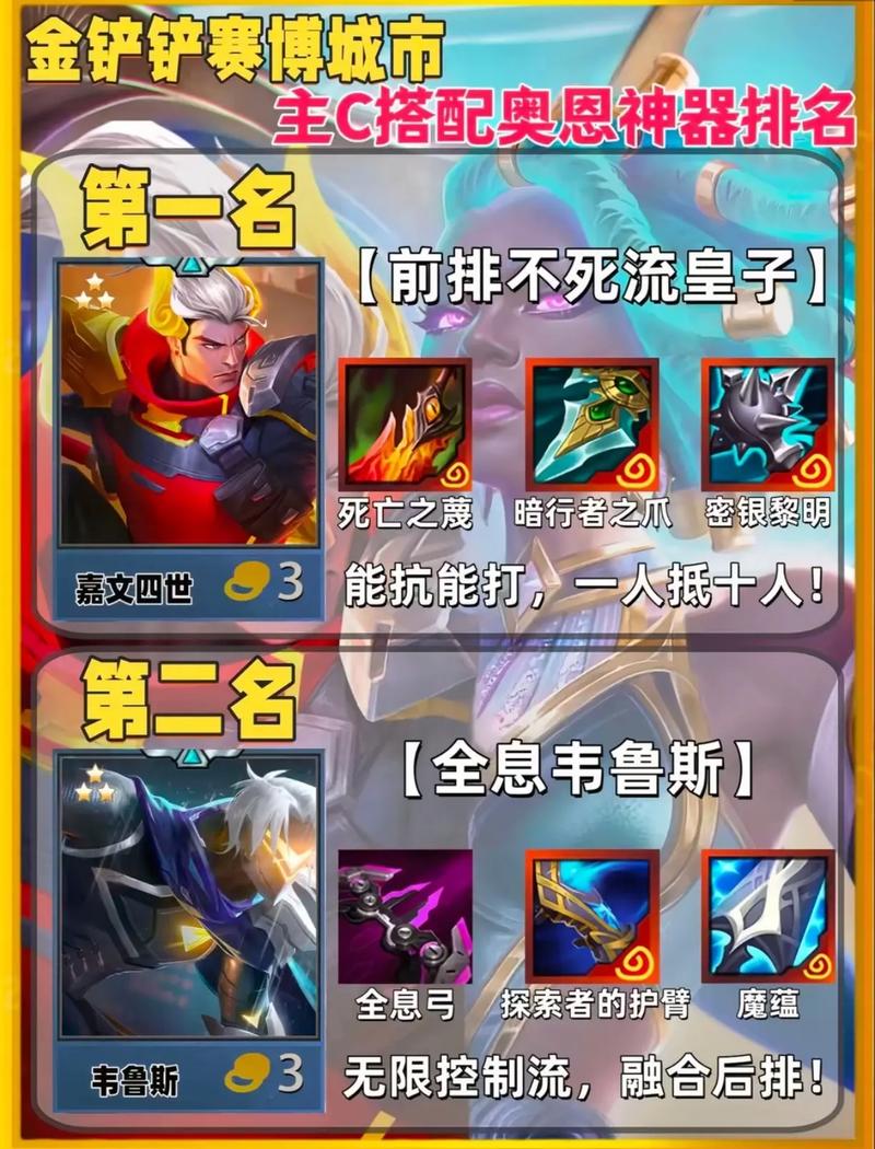 主C金克丝:必备装备为无尽、巨杀和羊刀(羊刀可换成杀人剑),以最大化其输出能力。主坦蔚:推荐装备狂徒、法袍和龙牙(龙牙可换成石像鬼),以增强其坦度和法术抗性。其余输出装:可给到厄斐琉斯或杰斯,以提升整体输出。大头:推荐三破甲装备,以针对敌方前排。