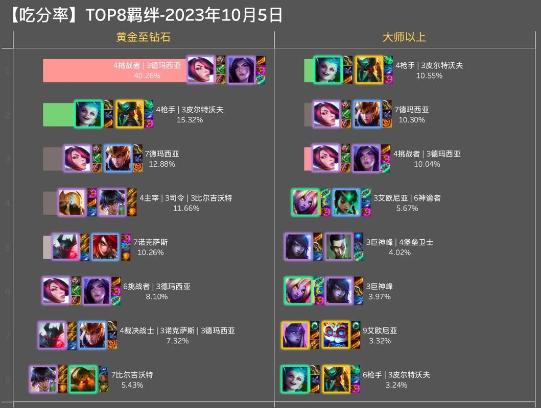 〖One〗、格斗维鲁斯:韦鲁斯、俄洛伊、塞拉斯、奥恩、EZ、赛芬。这套阵容成型速度很快,属于快攻吃烂分卡组。利用快速三星的高质量牌组,在前期就能取得连胜,运营和过渡相对简单,非常适合新手玩家。一打九顶级乌鸦:乌鸦、纳尔、龙女、艾希、瑟提、妮蔻、霞。