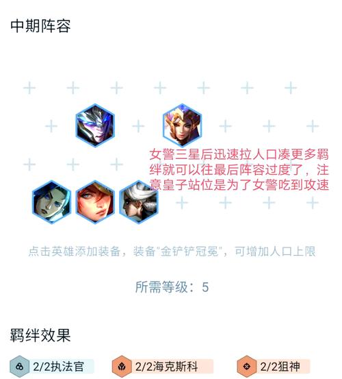 〖Five〗、金铲铲之战s13女警体系玩法思路与攻略 核心思路 围绕女警构建阵容:女警体系以其稳定的输出能力为核心,玩家需要围绕女警来构建高效阵容。关键在于合理搭配羁绊,如4狙神和4执法官,以提升女警的输出能力和团队的控制能力。前排坦度至关重要:狙神羁绊依赖于前排的存活来提供增伤效果。